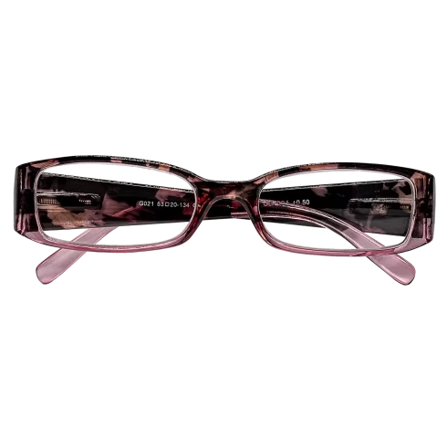Tyto brýlové obroučky G021 růžové jsou dostupné jak v plusových hodnotách (vhodné pro čtení) tak v minusových hodnotách (brýle do dálky). Skok po 0,50 dioptrii např. (-1,5 , -1,0 , … 0,50 , 1,00 , 1,50 , …..). Plastové obroučky s flexi stranicemi. Čočky jsou vyrobeny u plastu.